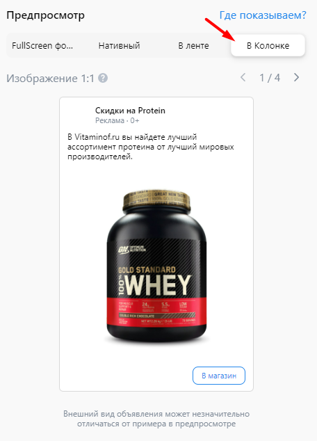 Справа в настройках можно посмотреть, как будет выглядеть объявление в ленте, в колонке, в нативном формате, в формате «Full Screen».