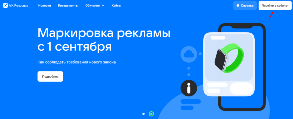 Для начала работы нужно перейти на сайт VK Рекламы и кликнуть на кнопку «Перейти в кабинет».