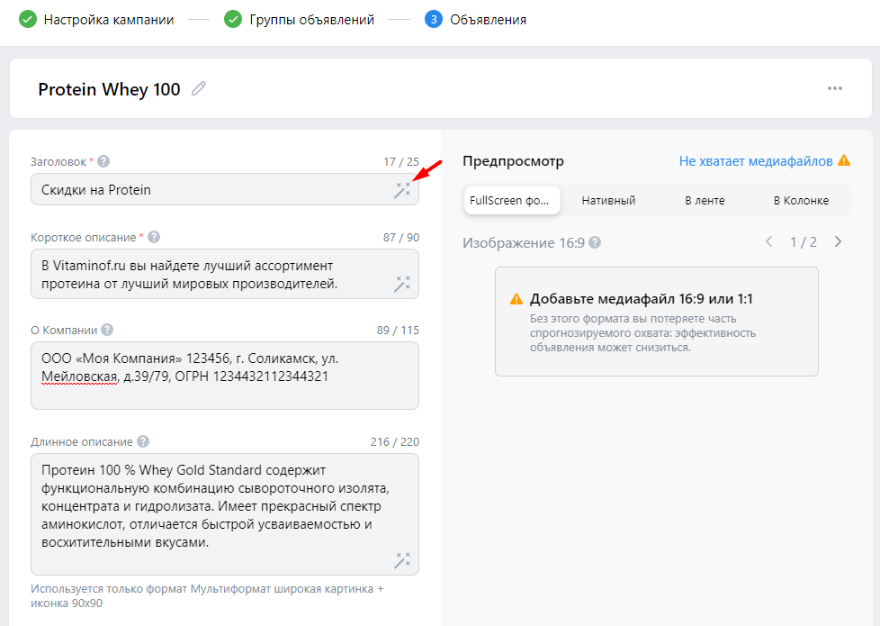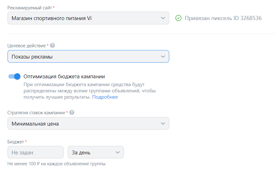 Настройка рекламной кампании разделена на три этапа, поэтому запуск во многом схож с запуском рекламы в кабинете Яндекс.Директа или myTarget. Показываем на примере интернет-магазина спортивного питания, как запустить рекламу и работать с аудиториями.