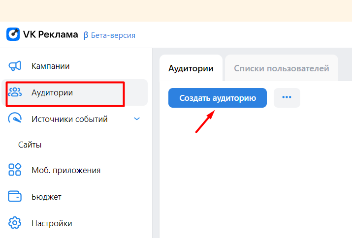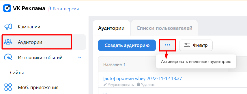 4. После этого нужно перейти в профиль VK Рекламы. В главном меню выбрать «Аудитория». На странице в меню нажать «…» — «Активировать внешнюю аудиторию».