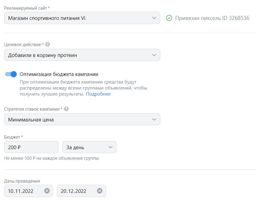 Даты проведения. Можно указать только дату старта рекламной кампании, а можно установить конкретный период проведения рекламы.