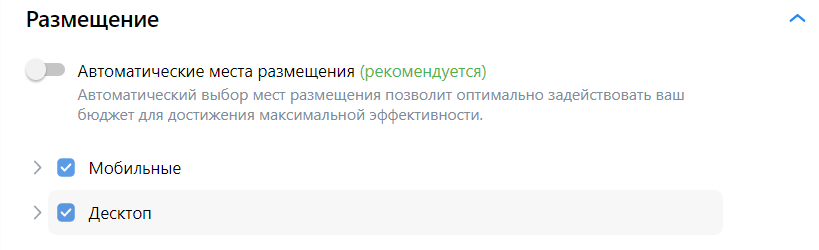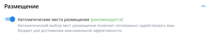 Размещение рекламы. По умолчанию в настройках задан автоматический подбор места размещения. В этом случае умный алгоритм сам решает, где показать рекламу, чтобы обеспечить максимальную эффективность кампании.
