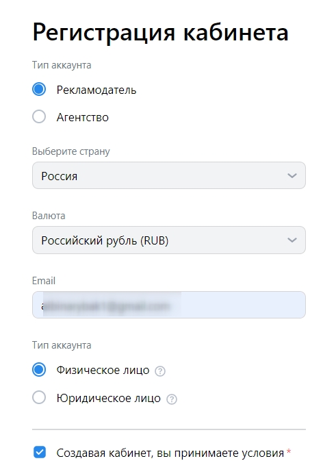 Тип аккаунта по виду деятельности. Аккаунт может открыть юридическое или физическое лицо. Если аккаунт регистрируется на юридическое лицо, нужно указать его реквизиты. Автоматически из других систем эти данные не подтягиваются.
