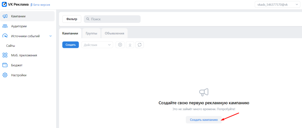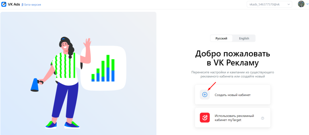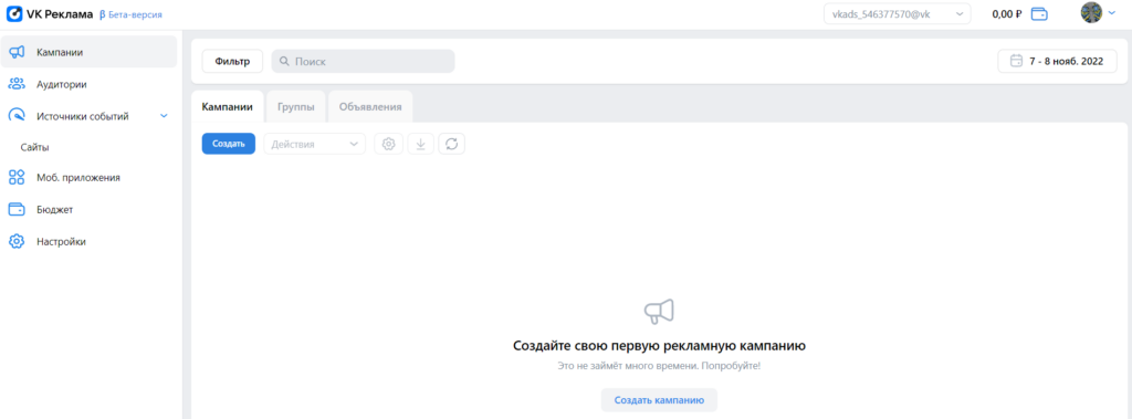 После авторизации и регистрации открывается доступ в кабинет VK Рекламы.