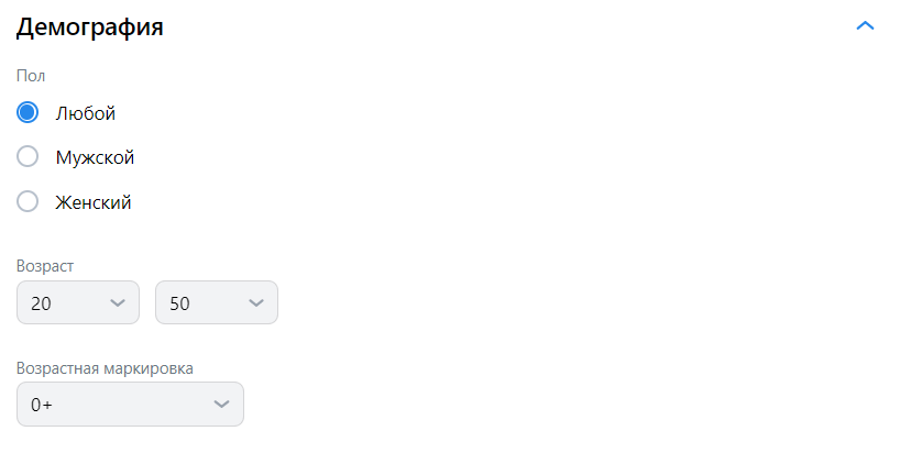 Таргетинг по демографическому признаку. Здесь доступны настройки по полу и возрасту. Также можно указать возрастные ограничения, если правила системы устанавливают требования к обязательной возрастной маркировке предлагаемого товара/услуги.
