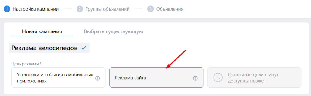 Даем название кампании и выбираем цель. В начале запуска рекламы доступно две цели — «реклама сайта» и «установки и события в мобильных приложениях». Остальные цели станут доступны в системе позже, после настройки целевых действий на сайте.