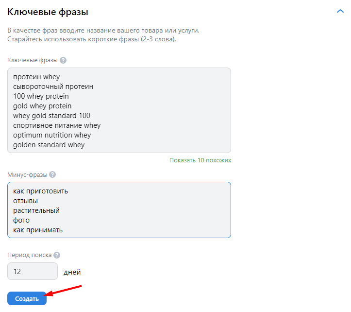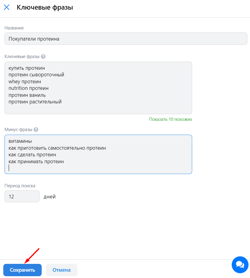 Ключевые фразы. В настройках указываются слова, по которым люди ищут продукт в ресурсах VK, и период поиска. Система собирает данные о таких пользователях и формирует аудиторию.