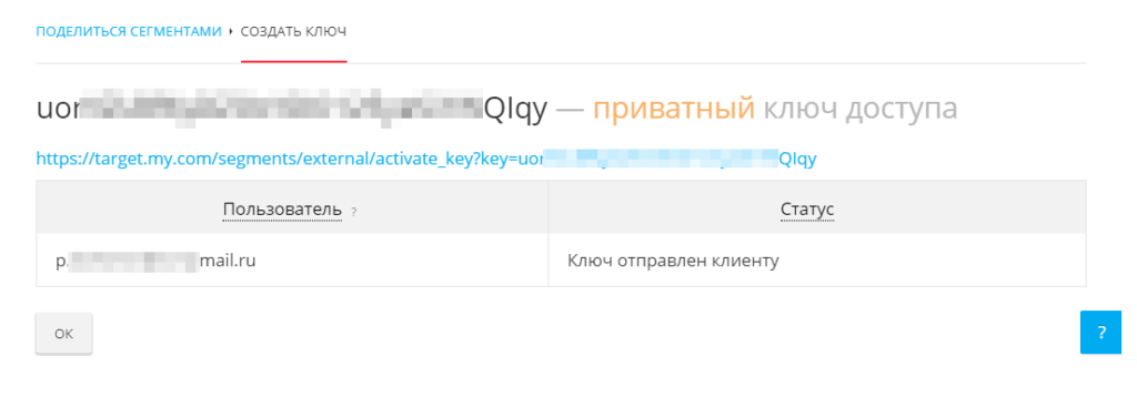 Для загрузки внешних аудиторий из myTarget нужно в кабинете myTarget сгенерировать код доступа на выбранный сегмент аудитории.