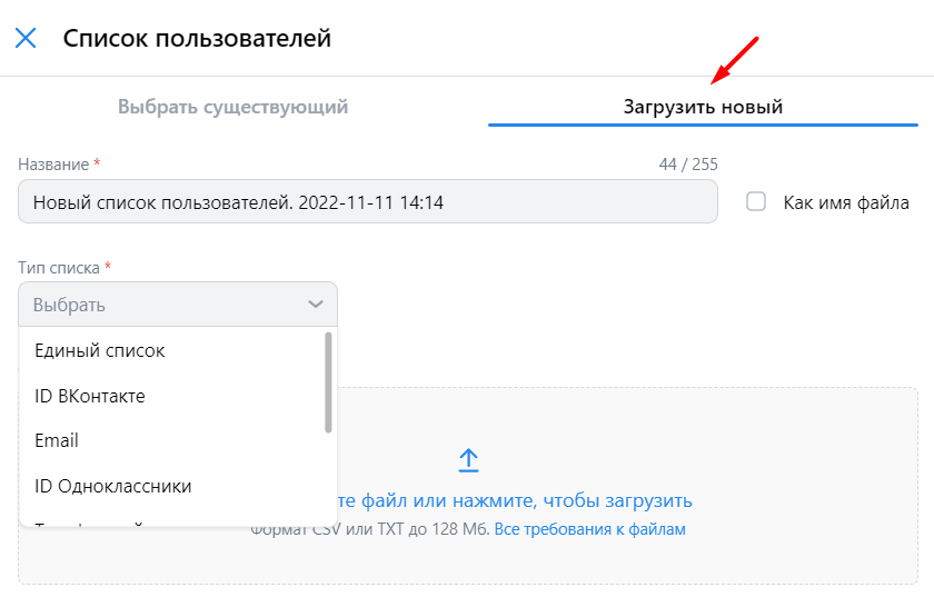 Файл с пользователями должен иметь вес до 128 Мб, формат CSV и TXT.