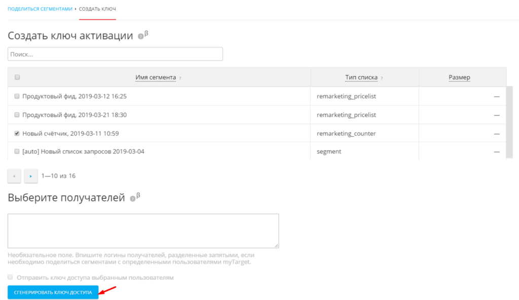 2. В списке сегментов выбрать подходящие источники или сегменты, к которым нужно предоставить доступ. После чего кликнуть на кнопку «Сгенерировать ключ доступа».