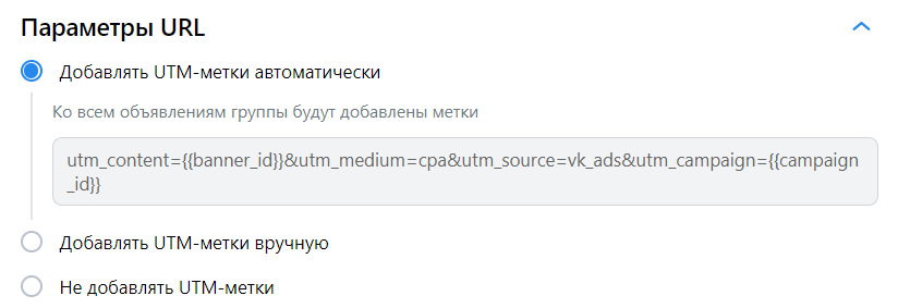 Параметры URL. Система автоматически добавляет UTM-метки для отслеживания количества кликов по баннеру. При необходимости можно добавлять UTM-метки вручную.