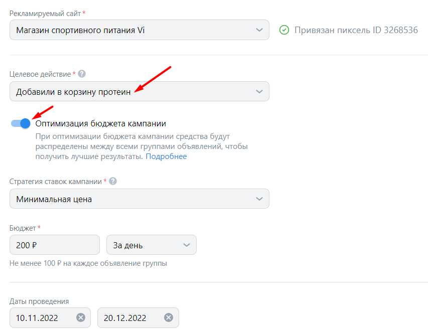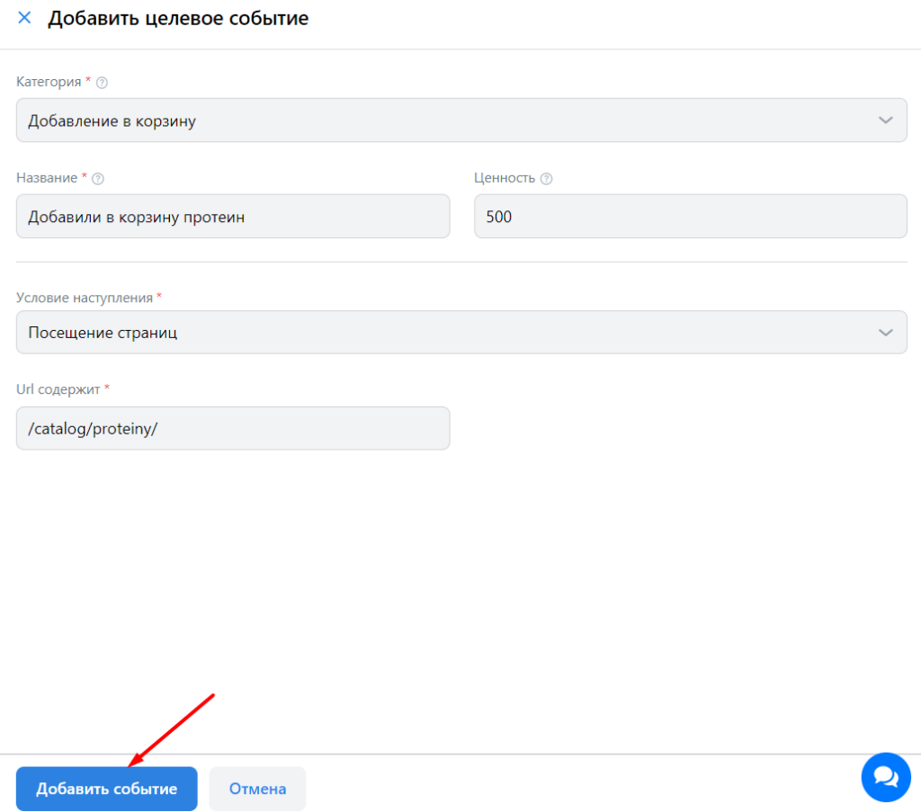 Теперь в настройках кампании в пункте «Целевое действие» появится возможность выбора настроенных события. В нашем примере настроено действие «Добавили в корзину протеин».