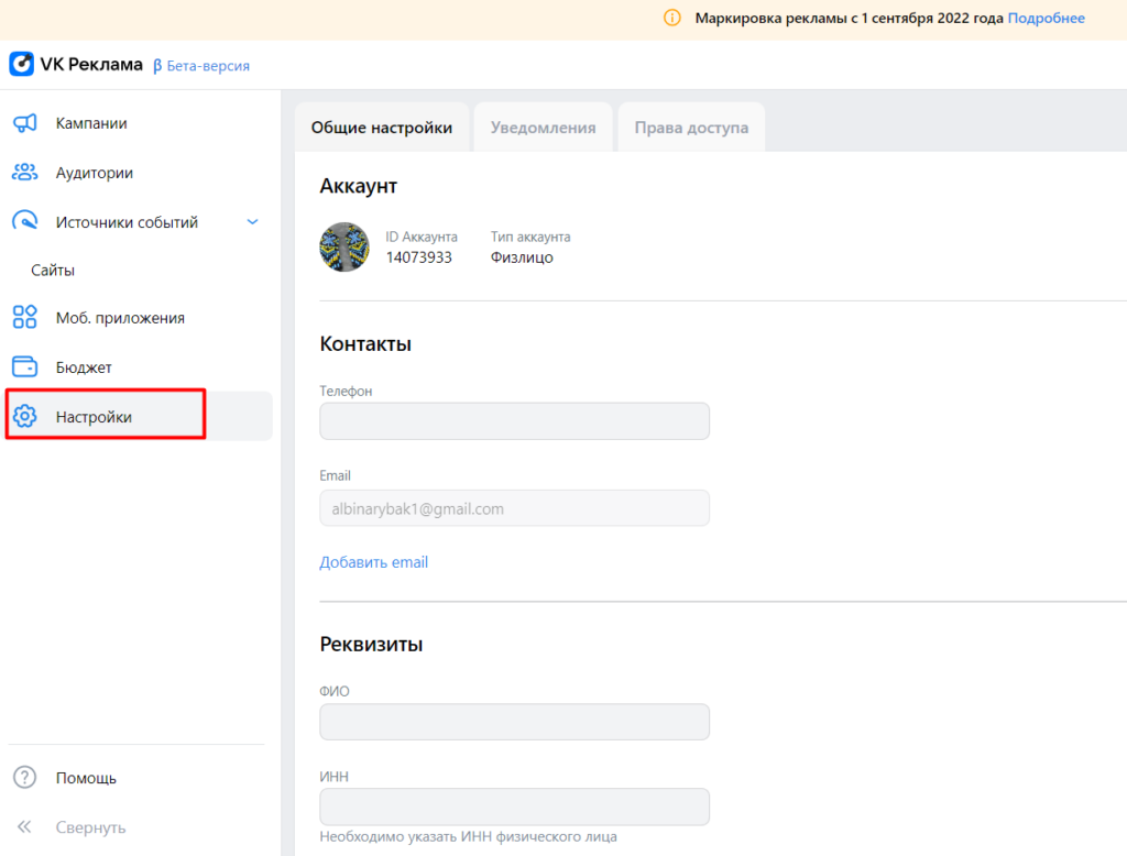 Прежде чем запускать рекламную кампанию, нужно в главном меню перейти в «Настройки». В общих настройках указываются ФИО и ИНН. Эта информация обязательна к заполнению для соблюдения Закона «О Рекламе» — для маркировки рекламы и передачи данных в ЕРИР.
