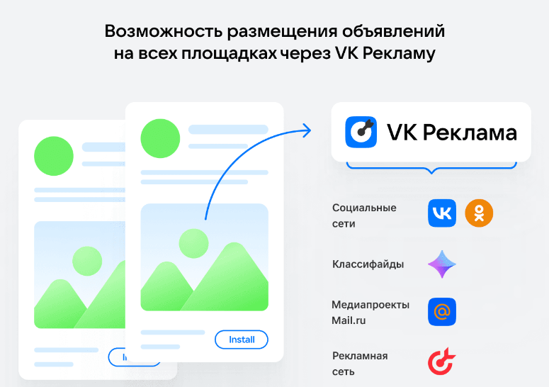 Запуск рекламы через новую платформу позволяет продвигать сайты и приложения одновременно в соцсетях ВКонтакте, Одноклассники, проектах Mail.ru, на сайте объявлений Юла и в рекламной сети VK.