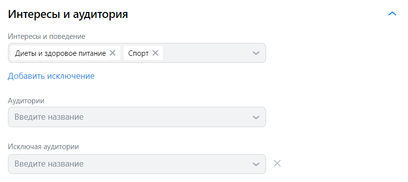 Таргетинг на интересы и аудиторию. В пункте «Интересы и поведение» задаются те сферы интересов, которые целевая аудитория ищет в интернете.