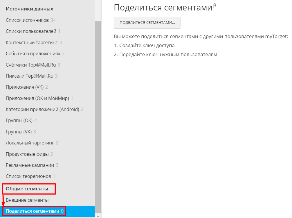 1. Перейти на вкладку «Аудитории». В блоке «Общие сегменты» выбрать «Поделиться сегментами» и нажать «Поделиться сегментами».