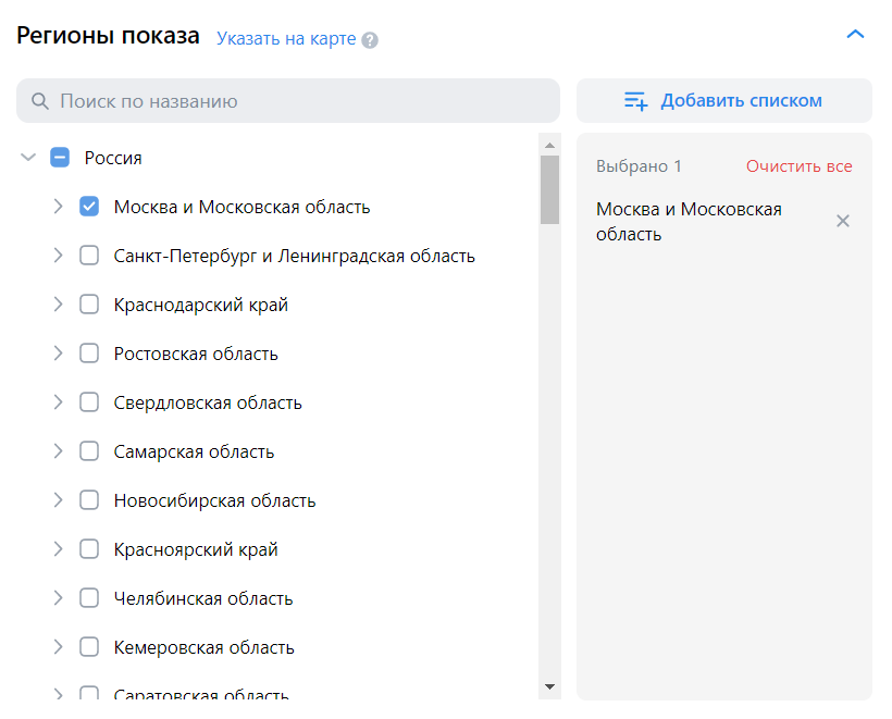 Таргетинг на регионы. Его можно настроить двумя способами: установить галочки напротив подходящих регионов или загрузить файл со списком регионов, в которых будет показываться реклама.