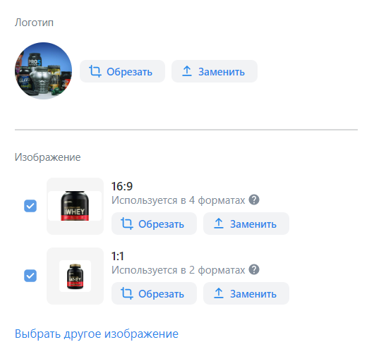 После написания заголовков и текстов добавляются логотипы и изображение. Допустимые форматы для обоих креативов: jpg, png, gif. Размер файла — до 5МБ. Минимальный размер для логотипа 100х100 px, для изображения — 600х600 px.