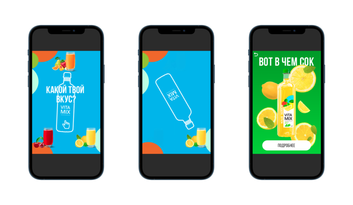 В ходе взаимодействия предлагается покормить животных на экране. Для этого используется механика «тянуть» — юзеру нужно нажимать на экран и протягивать товары бренда в определенное место. Когда пользовательское внимание захвачено интерактивом — показывается само рекламное сообщение.
