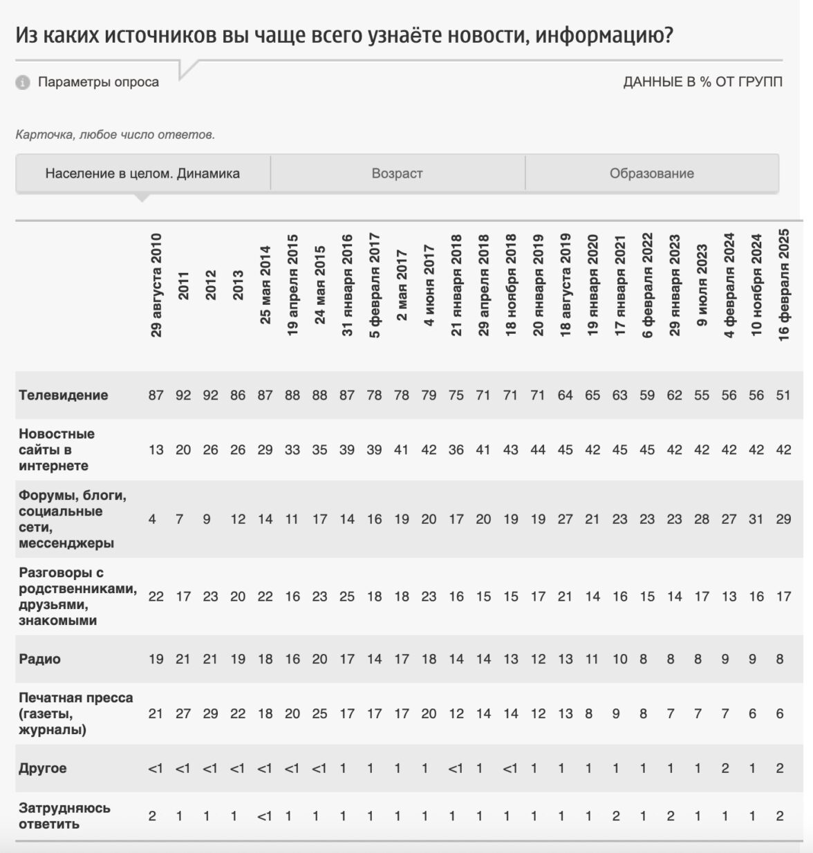 Победу телевизору во многом обеспечило старшее поколение. Телевидение — самый частый источник информации для россиян старше 60 лет (его предпочитают 81% представителей этой возрастной категории). В возрастной категории от 18 до 30 лет телевизионные новости часто смотрит лишь каждый пятый (19%), тогда как цифровые новостные каналы предпочитают более половины (59% — сайты, 53% — соцсети). Кроме того, у россиян с высшим образованием телевидение менее популярно, чем в целом по стране, а новостные сайты и соцсети с блогами, наоборот, более популярны.