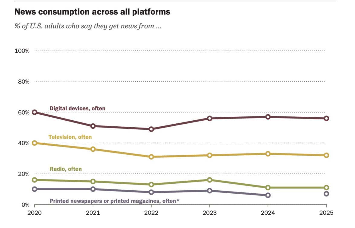 Согласно опросу Pew Research, проведенному 18–24 августа 2025 года, подавляющее большинство взрослых жителей США (86%) утверждают, что хотя бы иногда читают новости на смартфоне, компьютере или планшете. 56% утверждают, что делают это часто. По сравнению с данными опроса прошлого года этот показатель практически не изменился.