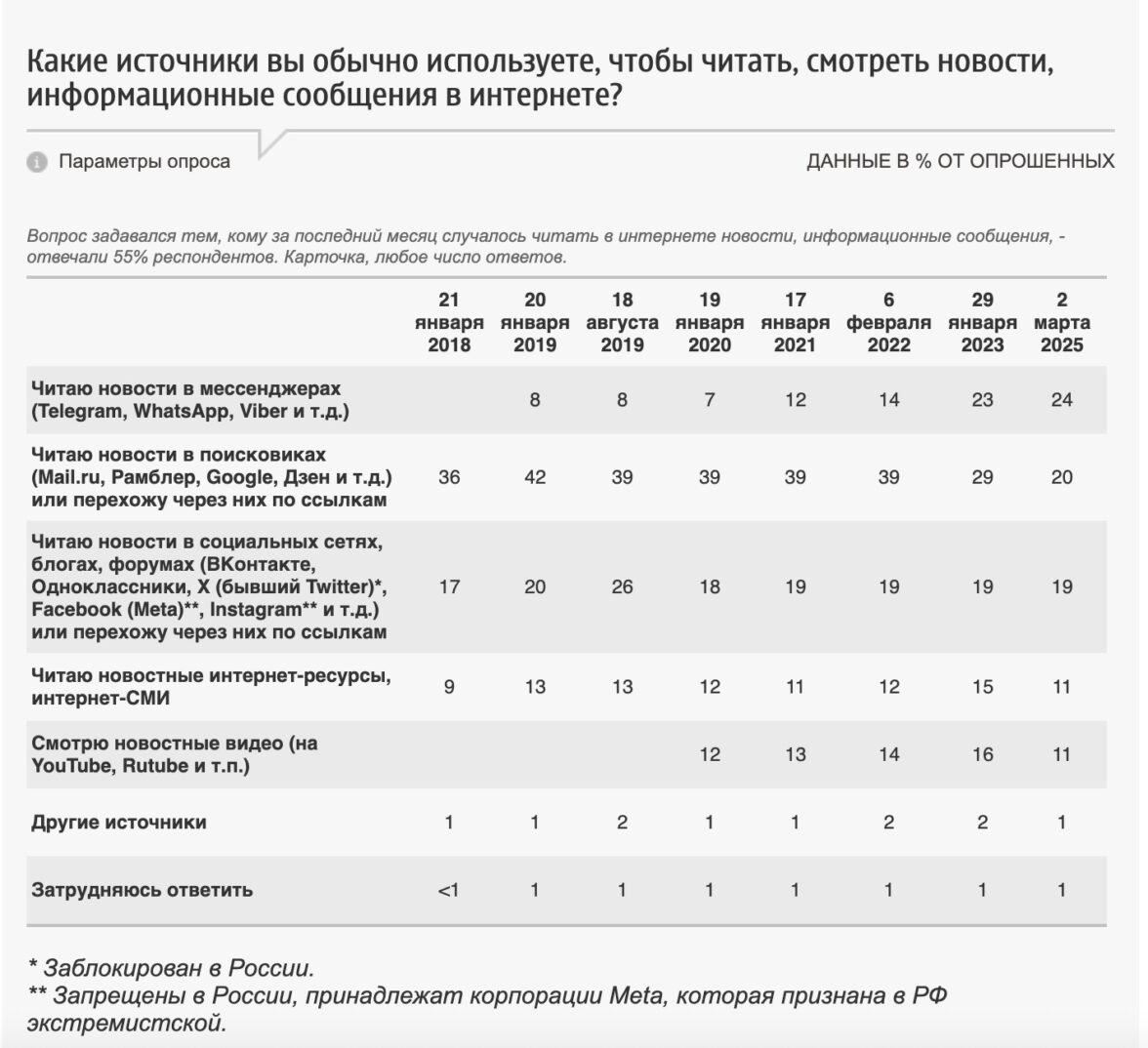 Среди соцсетей, блогов и мессенджеров самым популярным источником новостей в России является Telegram (его назвали 25% опрошенных). 16% выбирают ВКонтакте, 7% — WhatsApp и Viber, 4% — Одноклассники, 3% — Instagram*, 2% — Мой мир на Mail.ru, 1% — Facebook*, менее 1% — заблокированный в России Х и LiveJournal.