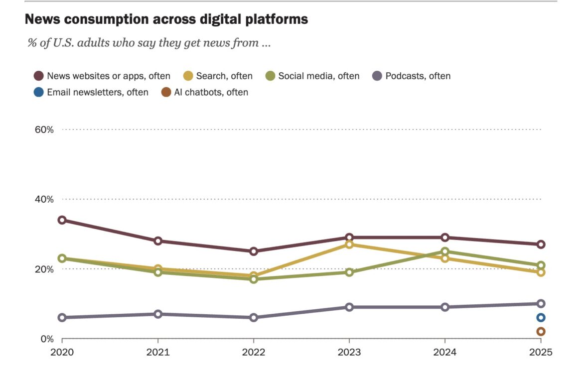 Наиболее популярные варианты потребления новостей на цифровых платформ в США. Сверху вниз (по показателям 2025 года): новостные сайты, соцсети, поиск, подкасты, ньюслеттеры в электронной почте, чатботы.