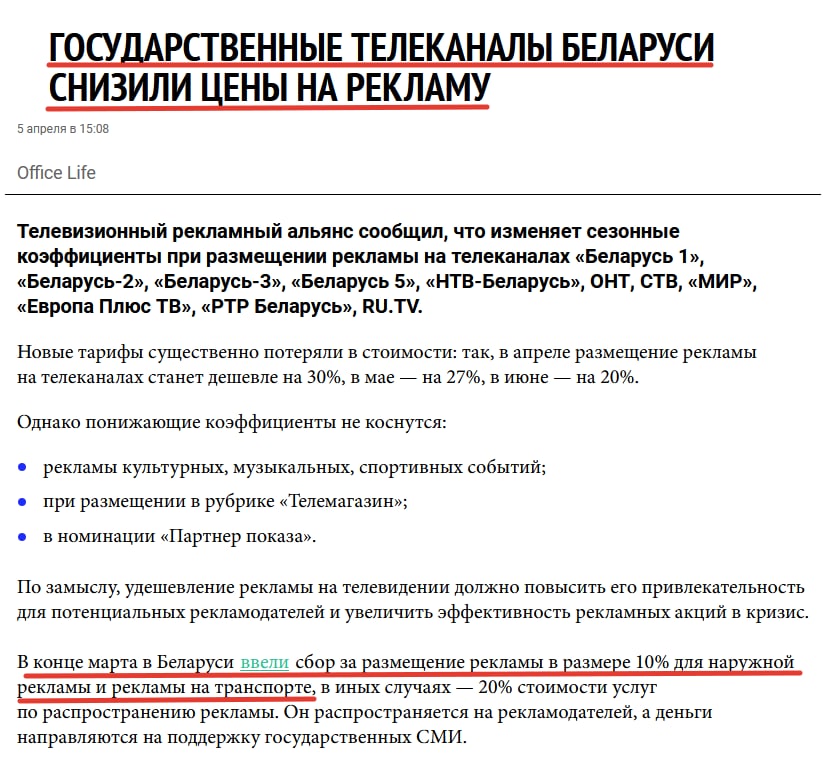 И вот еще одна прекрасная иллюстрация, как работает эта схема, пришла из Белоруссии. Всего через пять дней после того, как операторов наружной рекламы обложили 10% оброком в пользу государственных телеканалов, эти же телеканалы на 20-30%(!) снизили расценки на рекламу. В России экономическая модель точно такая, только субсидирование наружкой своего прямого конкурента происходит не целевым побором, а через налоги и госдотации.