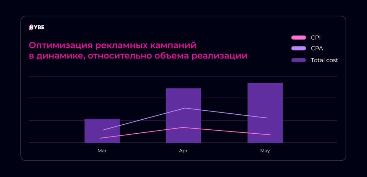 Параллельно с ростом объемов команда выстраивала динамическую оптимизацию кампаний относительно объема реализации. По мере масштабирования закупки трафика удавалось контролировать CPI и CPA, перераспределяя бюджеты между SSP и эффективными связками приложений.