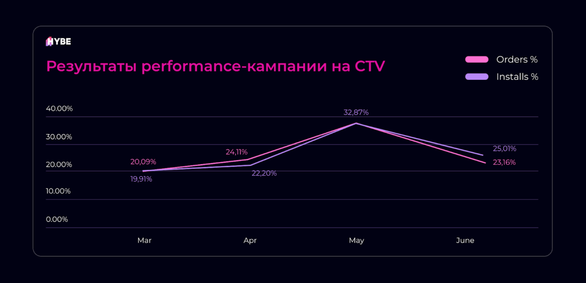Performance-кампания на CTV продемонстрировала устойчивый рост ключевых показателей уже в первые месяцы размещения. Доля установок и заказов увеличивалась от месяца к месяцу, достигнув пиковых значений в мае.