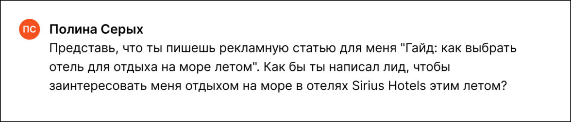 Во время создания очередного материала о сети отелей мы решили попробовать комплексный подход: в сердце статьи использовать уже опубликованный материал с хорошими показателями, для уточнения деталей предоставлять ChatGPT отрывки из другой рабочей статьи и контролировать работу ИИ при создании каждого смыслового блока. За техническую основу взяли промты из обучения «ПромоСтраниц» «6 шагов к тексту от AI».