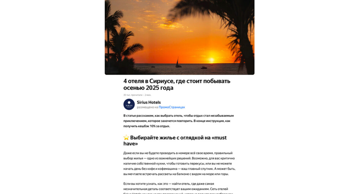Новый материал должен был стать гайдом по выбору отеля для отдыха на море. Этот жанр очень востребован в «ПромоСтраницах»: благодаря практическим рекомендациям можно аккуратно подвести читателя к выбору в пользу рекламодателя.