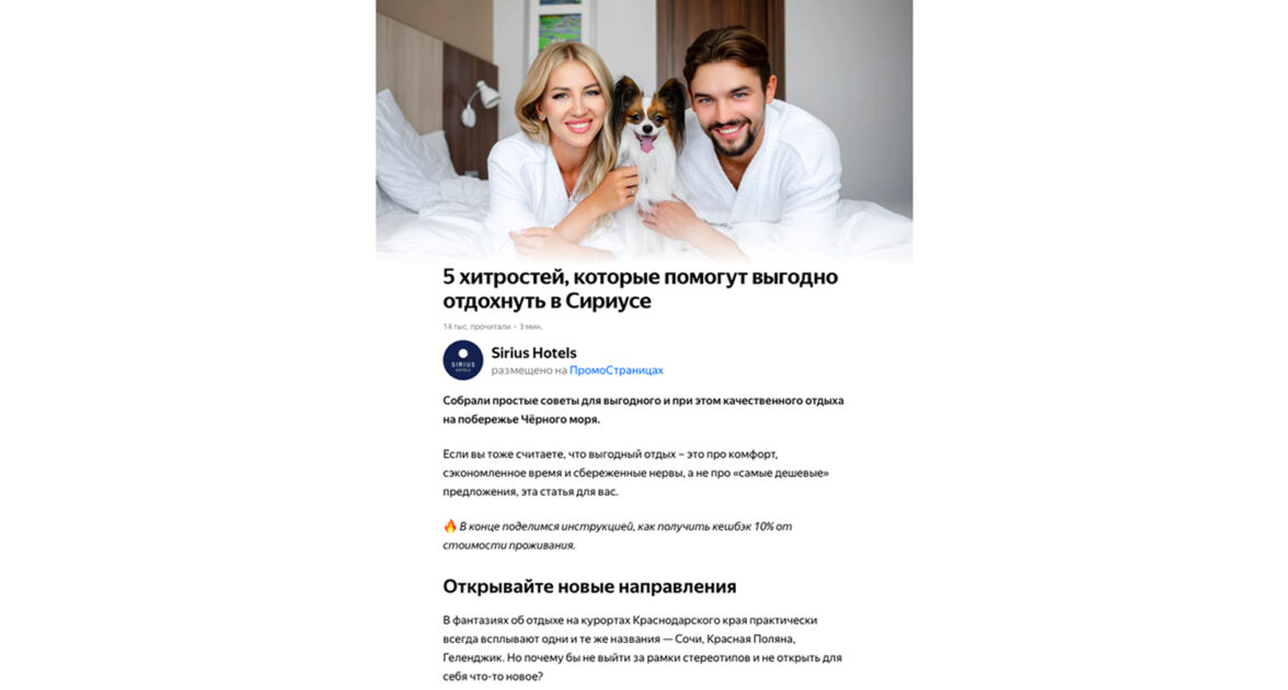 2. статья, опубликованная в «ПромоСтраницах» и имевшая одни из самых высоких brandformance-результатов за все время. В ней давались советы для организации комфортного и выгодного отдыха на Черном море. Особое внимание уделялось возможности сэкономить за счет отдыха в межсезонье, бронирования напрямую через сайт, бонусов для семей и т.д.