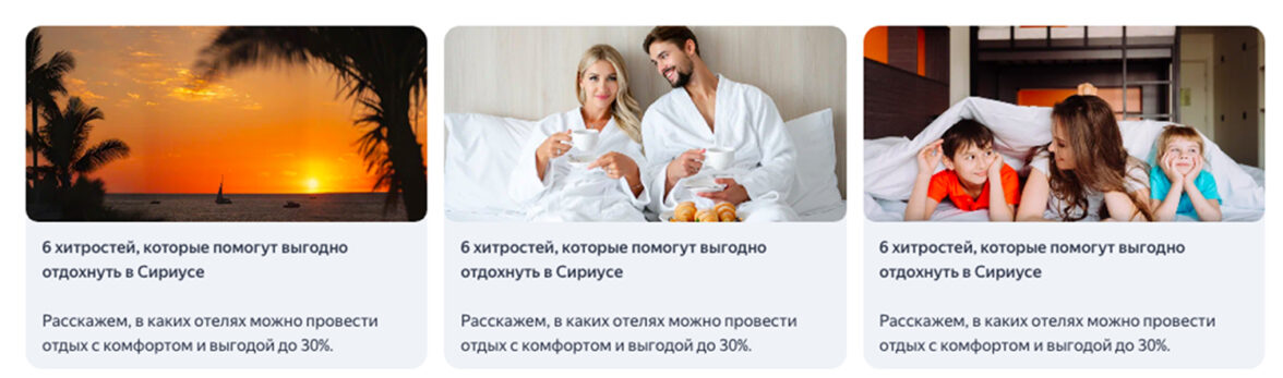 Мы занимаемся комплексным продвижением сети черноморских отелей Sirius Hotels, используя разнообразные рекламные инструменты. «ПромоСтраницы» открывают воронку продаж: они позволяют выйти на потенциально заинтересованных пользователей, подробно рассказать об инфраструктуре отелей и мягко подвести к конверсии. «ПромоСтраницы» демонстрируют отличные результаты во многом благодаря информативности лонгридов и длительному контакту с аудиторией. Поэтому перед нами стоит задача не только регулярно выпускать новые материалы, но и масштабироваться, улучшая результаты прошлых рекламных кампаний.