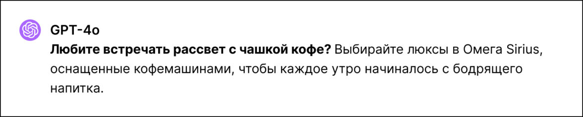 Когда мы начали работу над первой главой, пришло время материала, который имел хорошую структуру описания отелей. Однако мы не показывали его целиком, а только копипастили нужные фрагменты. Основной идеей первой главы должны были стать факторы выбора отелей. Мы привели в пример часть из третьего текста про отдых с детьми, когда родителям важно наличие в номере кухни: «Едете на море с семьей? Обратите внимание на номера с кухней в Прибрежном квартале, где можно легко готовить перекусы и обеды для ваших малышей». ИИ должен был придумать ряд жизненных ситуаций, на которые отвечало бы соответствующее оснащение номеров в разных отелях сети. Он хорошо с этим справился. Например, для люксов с кофемашинами он предложил такой вариант:
