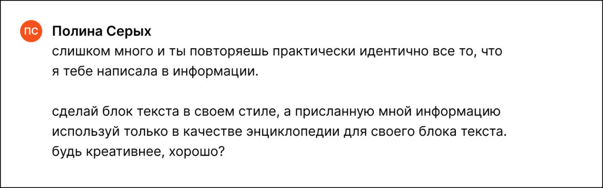 ChatGPT неплохо отрабатывал задачи копирайтера, но всегда находилось, что улучшить. В среднем каждый результат имел пять итераций: содержание уточнялось, более четко формулировалось, дополнялось важными деталями. Бывало, ChatGPT ленился и просто перефразировал то, что предоставлял редактор. В таких случаях мы прямо указывали ИИ на это: