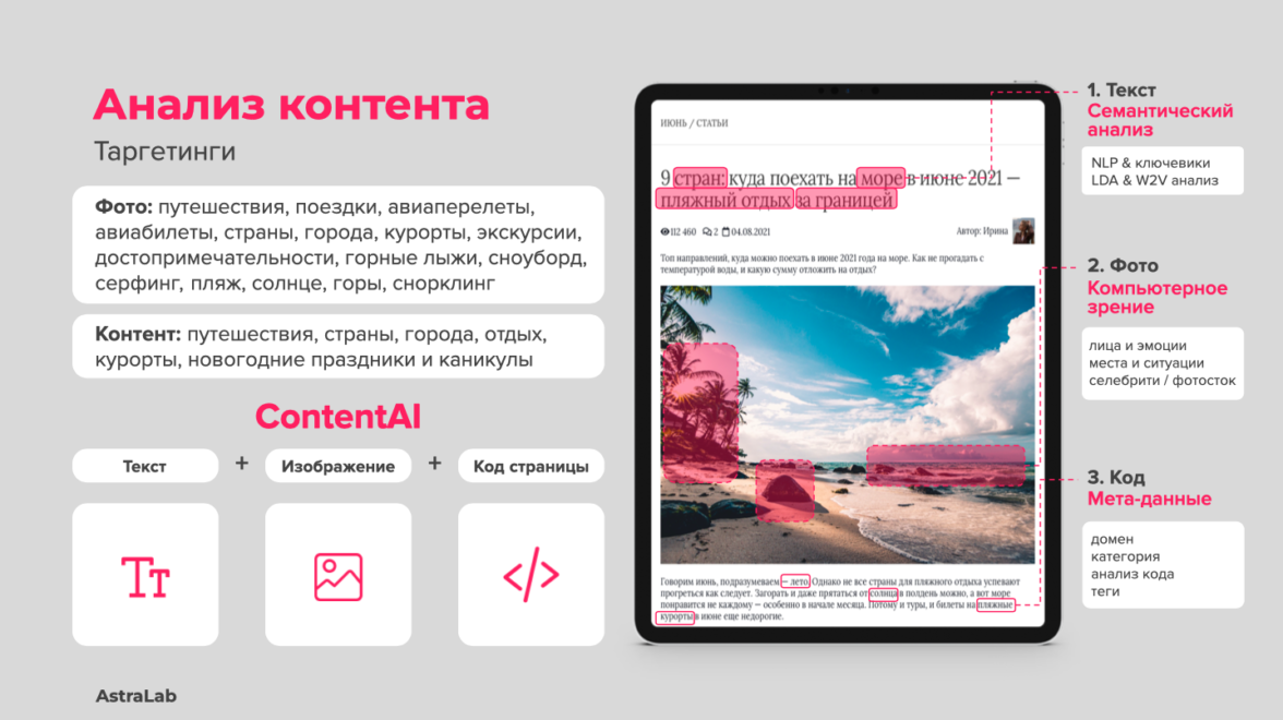 Система искала статьи про путешествия, разделяла их на категории в соответствии с тематикой креативов — море, горы, города, равнины. Например, если пользователь читал статью “Куда поехать на море летом 2021” и в ней было фото моря — то поверх фото динамически размещался креатив с рекомендацией провести отпуск в Сочи, Симферополе или Анапе. И так по аналогии с другими креативами.