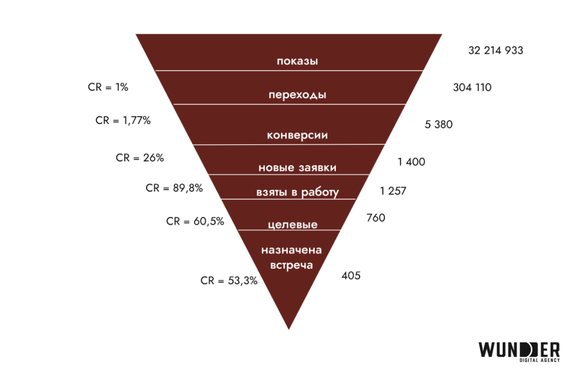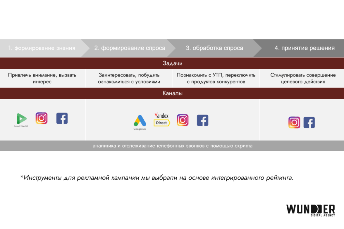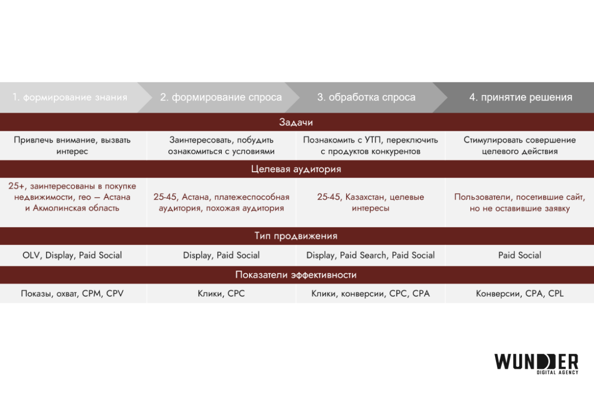 В ходе рекламной кампании команда Wunder Digital работала в рамках четырех основных этапов воронки продаж: Формирование знания — Формирование спроса — Обработка спроса — Принятие решения.