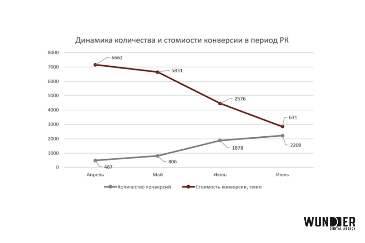 Учитывая успех предыдущего месяца в июле специалисты Wunder Digital перераспределили бюджет в пользу видео Facebook*, а также подключили биддер (инструмент контроля ставок) на основе искусственного интеллекта, который увеличил количество конверсий в Facebook* на 29%, при этом снизив стоимость 1 конверсии на 21%. В итоге июль стал самым результативным месяцем, принесшим 2209 конверсии.