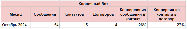 Для сравнения возьмём показатели кнопочного бота, так как он наиболее схож с принципом работы ИИ-продавца, в отличие от блиц-опроса, где люди оставляли контакты ради бонуса. Октябрь — это последний месяц работы кнопочного бота с наибольшим числом полученных контактов.