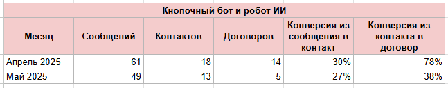 Конверсия из сообщения в контакт осталась примерно на уровне кнопочного бота, но при этом выросла конверсия в договор — от 12% до 51%. Наибольшее количество договоров мы получили в апреле — 14, это на 10 договорв больше среднеей за прошлой год, а продаж более чем на 420 000 рублей. Это говорит о том, что ИИ-продавец передает в работу уже более прогретые и готовые к заключению договора контакты.