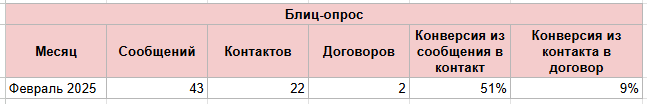 Такая схема работала, но люди часто не проходили бота до конца, останавливались на приветственном сообщении или информации о стоимости обучения. В среднем конверсия из сообщения в контакт была на уровне 28–30%, а договоров было 4–5.