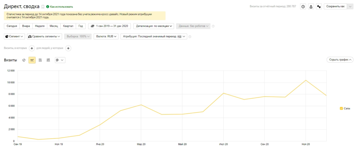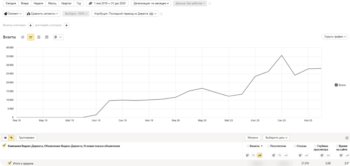 К тому же отсутствие четко настроенных целей в «Яндекс.Метрике» усложняло анализ. Мы использовали данные CRM клиента и электронной коммерции, но специфика их закупок требовала особого подхода, который мы внедрили и продолжаем применять.