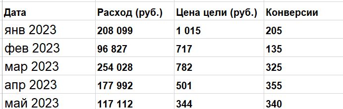 Из скриншота видно, что самый пик лидов по оптимальной цене в 695 р пришёлся на март 2022 года. Декабрь 2022 «обрадовал» нас самой высокой стоимостью лида: почти 2 500 за 1. Здесь мы видим и снижение количества конверсии до 46.