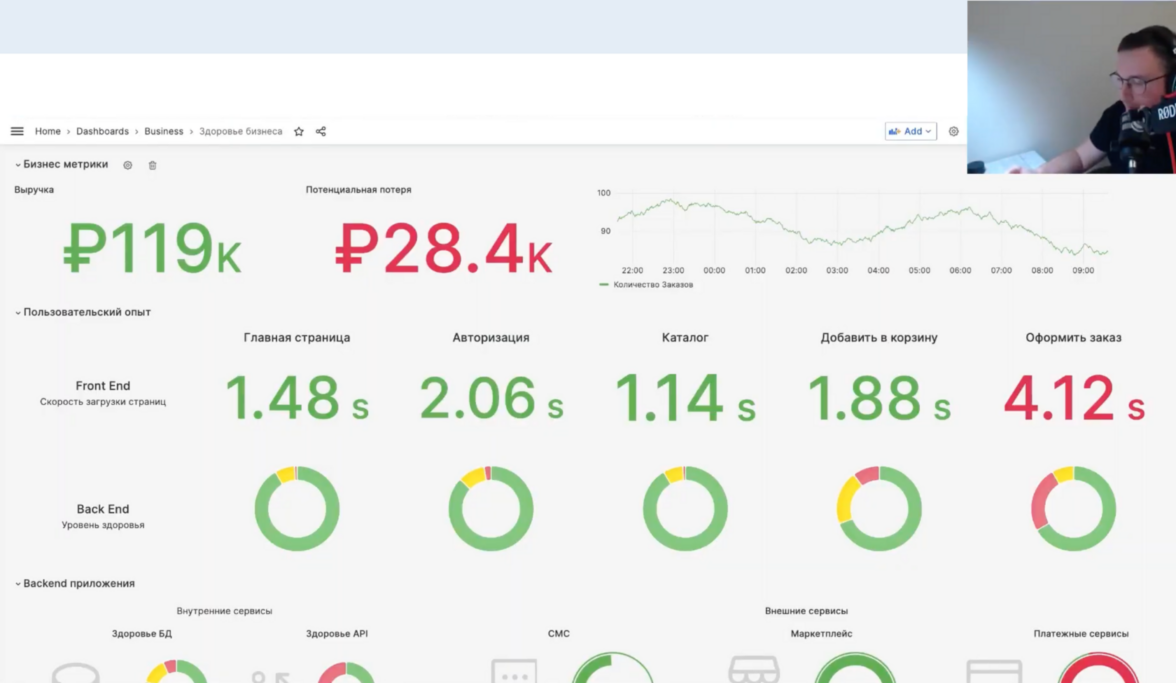 Инженер по внедрению GMonit Денис Василенков провел онлайн-демонстрацию четырех модулей платформы: Frontend, Backend, Infrastructure и Mobile и показал, как работают кастомные дашборды с индивидуальными бизнес-метриками, автоматическая карта сервисов, тепловая карта, интерфейсы мониторинга инфраструктуры, внешних интеграций и фронтенда. Участники встречи увидели, как быстро анализировать данные телеметрии и принимать оперативные решения на их основе.
