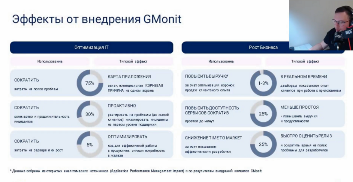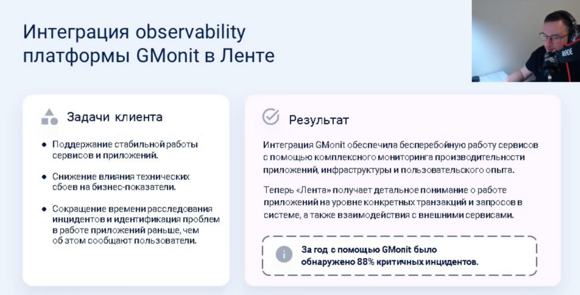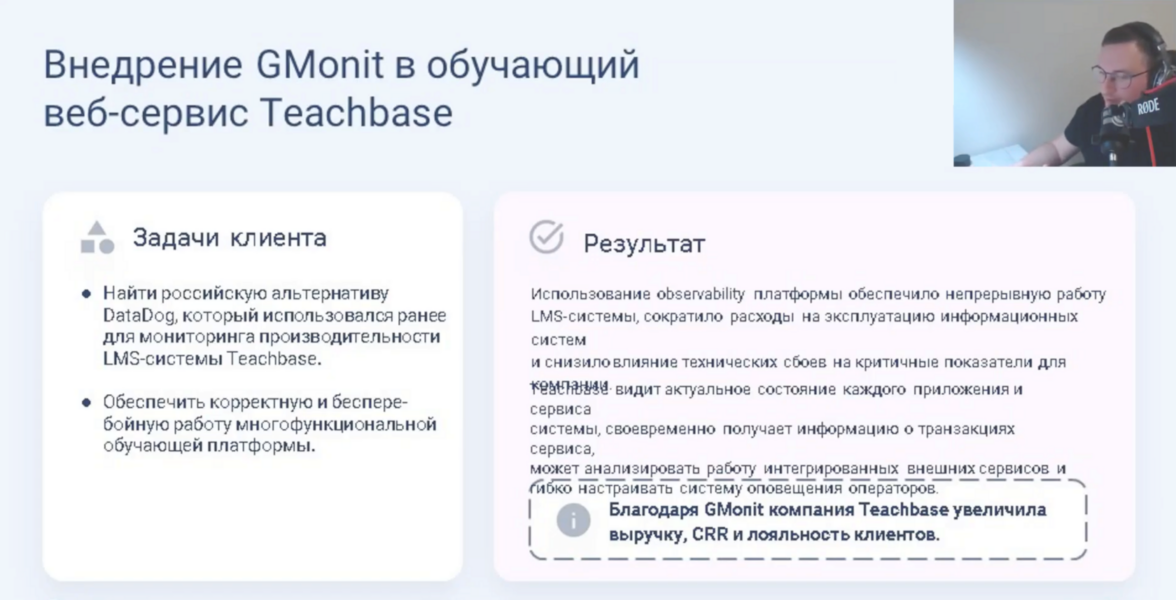 Также Денис поделился результатами внедрения инструмента APM-мониторинга GMonit в реальные приложения таких компаний, как Лента и Teachbase. Рассказал о задачах и полученных результатах.