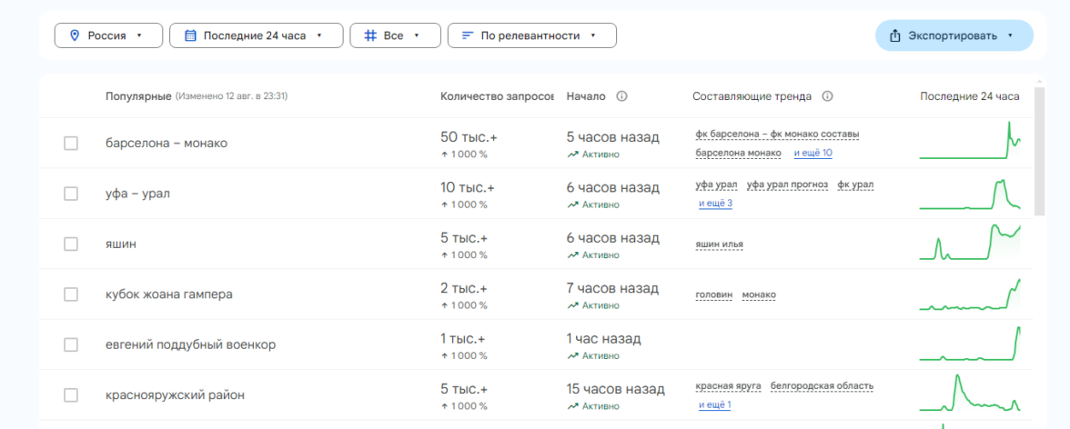 Темы, которые популярны в период от последних четырех часов до семи дней, можно увидеть в Google Трендах. Их можно отсортировать по стране, названию, популярности. В колонке «Составляющие тренда» показаны входящие в запрос и близкие ключевые фразы.