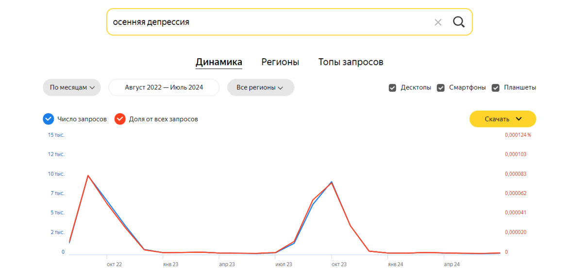 Некоторые темы имеют четко выраженный сезонный спрос — это события, происходящие с определенной периодичностью: премии, церемонии, конкурсы, праздники, гороскопы. Проверить сезонность ключевой фразы можно в Яндекс Вордстат. Введите запрос — на вкладке «Динамика» будет показано, как менялся поисковый спрос за последние два года.