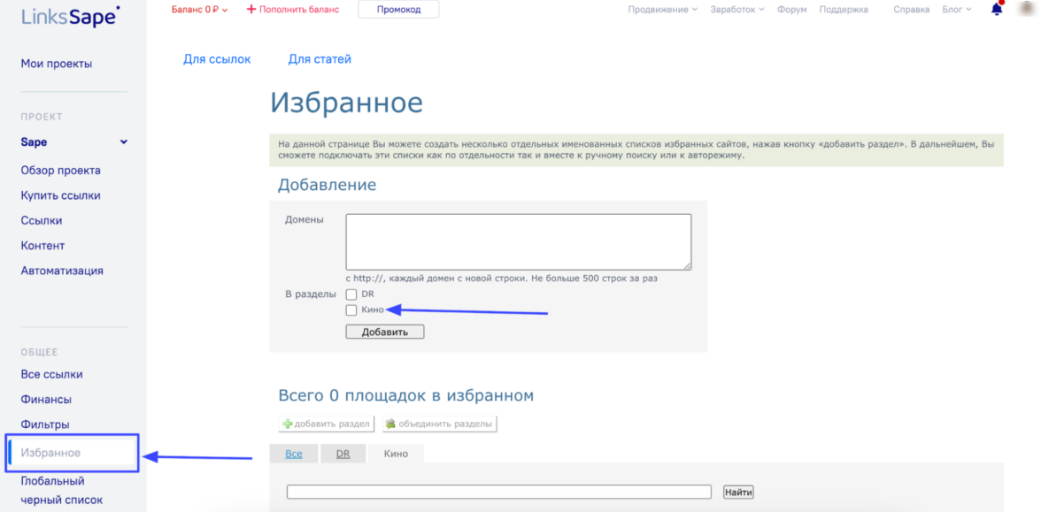 2. В личном кабинете платформы LinksSape откройте «Избранное» и в соответствующем окошке укажите URL этих площадок. После этого кликните «Добавить», чтобы подтвердить свой выбор.