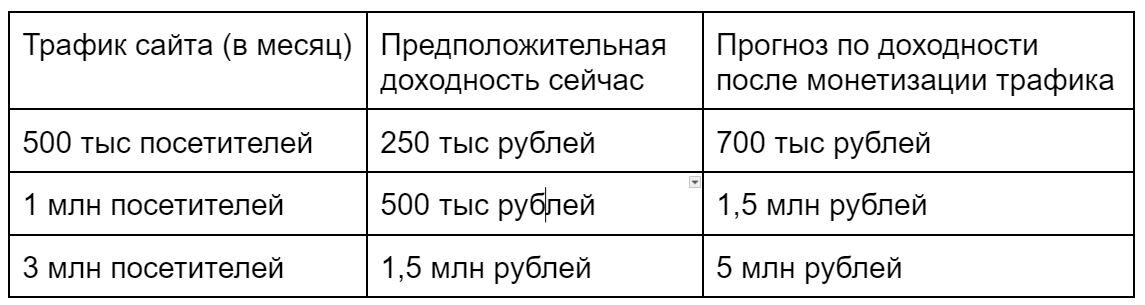 Я бы не хотел озвучивать конкретные цифры. Готов сказать, что с монетизацией трафика доходность сайта увеличилась в 3 раза. В 3 раза относительно дохода с прямых продаж. Мы каждый месяц фиксируем, какая доля заработка идет с продажи трафика — и показатель не опускался ниже ни разу за два года.